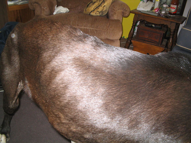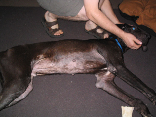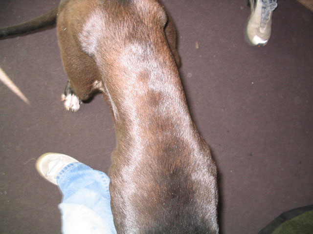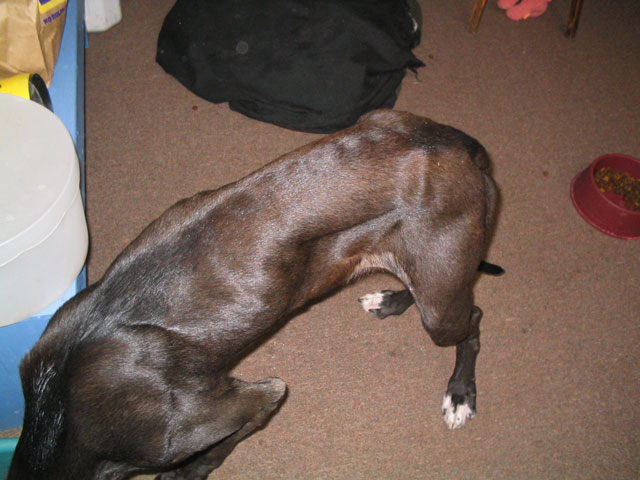 Roscoe is approx. 8-month-old un-neutered male, extremely thin and malnourished. Owners just didn't want to / couldn't afford to feed him. They obviously just threw him outside and did not bother with him at all. He had two large fluid-filled sacs on his elbows, one is completely healed and one looks a lot better, but has a long way to go. His skin and hair are horrible. He is gaining weight slowly, but seems happy and healthy despite his appearance. He needs manners!!!!! But he is learning. He is good with all people, but may be too hyper for small children unless he goes to an experienced dog owner. However, Roscoe is very sweet, and wants to please everyone. He plays well with all of our dogs (males and females) and with our cat too. We are working on house training and he is doing much better there. He has never had an accident in his crate and does well in there at night and is easy to put in his crate. His tail is happy and has now split open . We have it taped up. We should be able to be neutered by the end of Aug. Heartworm neg. Very sweet boy.
