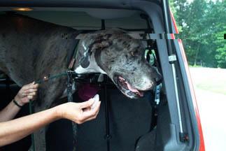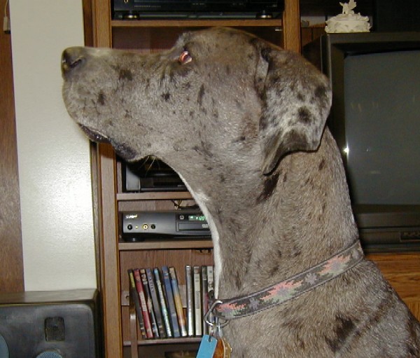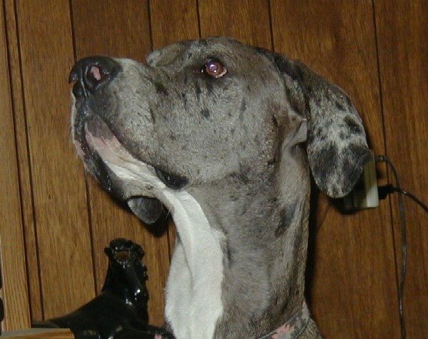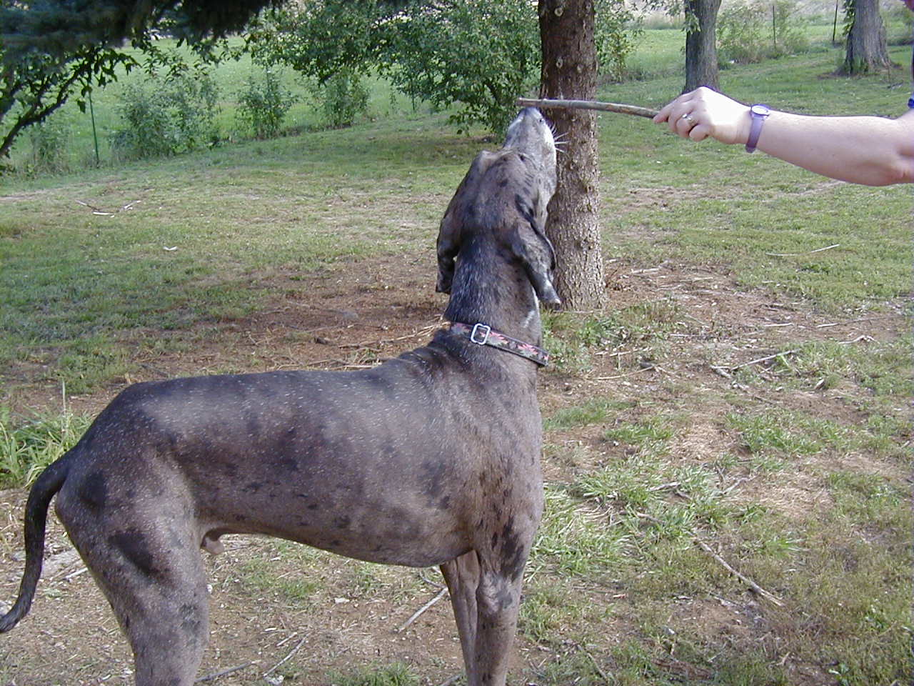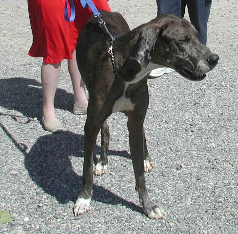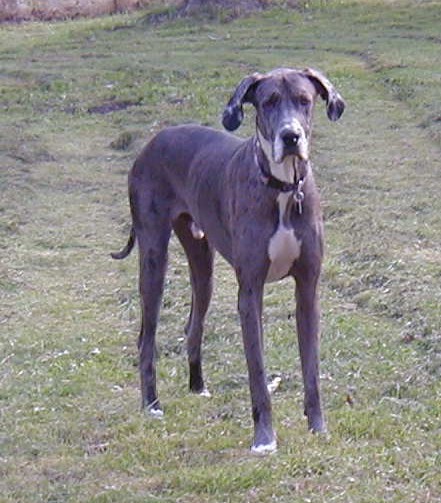 Apollo - Apollo was 2 in August. He's a beautiful merle neutered male with a white chest and 4 white feet. He has natural ears that he holds away from his head, looking like a little girl with her hair done in pony tails. He's very thin right now, but gaining weight. As far as we know he has no health problems, his vet check was great. Apollo suffers from terrible separation anxiety. That's what brought him into rescue, he'd bark while his owners were gone, and the neighbors complained. When I go in the bathroom, and shut the door, he sits outside the door and whines and paces. He takes every step I take, constantly glued to my side. His previous owners did report that he would chew on the door/knob/frame more than he would chew on anything else when left alone. We are working on crate training, but he is so afraid of being left alone, it's going very slowly. He IS a cabinet cruiser, and food thief, you have to watch him very, very close, he stole a lick of pie right out from under my hand. He will "go lie down" if I insist while we eat, but I have to tell him several times. He made himself at home on the couch, and wants to sleep on my bed. I have to insist that he sleep on his, he's not happy about it, but he will. He's a sweet boy, loves cuddles, in fact demands them, and I have to make him "sit" before I will pet him, to keep reminding him that I'm in charge. His favorite thing in the whole world is ice cubes, that bottom will hit the floor very quickly for "one of those cold, slimy things". Apollo will need a home where someone can be with him all day, and be very patient with his need to be "attached at the hip." His separation anxiety may be made a little better by having a companion, but he's afraid of dogs, so it would have to be a very mellow one. His previous owners tried to take him to a dog park several times, but he was so afraid and stressed out that they had to quit. Apollo does chase cats, so a home with cats would not be best for the cat, we'd rather he didn't live with one and terrorize it constantly. Apollo did fine with a 4 year old child, but he was given a clear escape route, never cornered, and the child's quick movements scared him, so he left the room, but he allowed a couple of pats from the child first. Apollo is basically a scardy cat (with everything BUT cats) who needs patient, understanding forever parents. |
