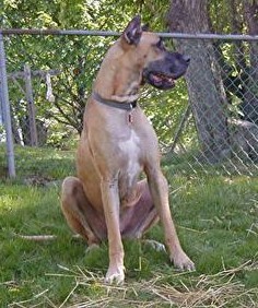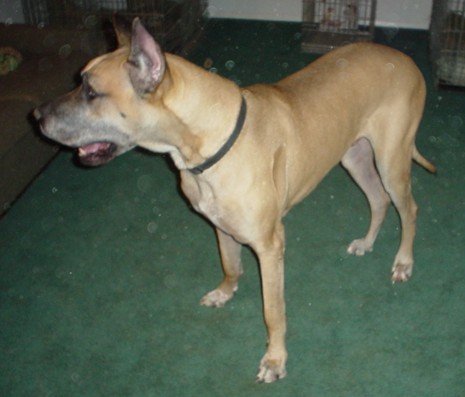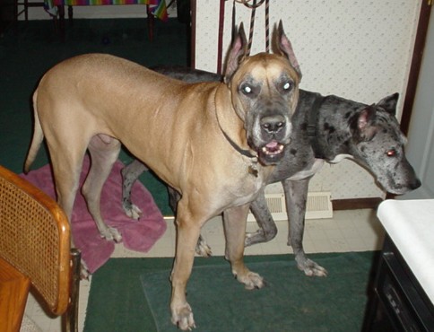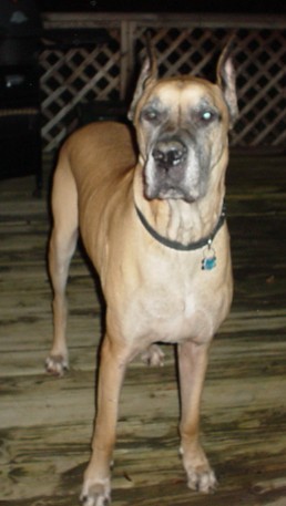 male fawn ~ 7 yrs old. He weighs in at 170lbs. Absolutely loves to play and be chased with whatever toy he has decided to keep from you. The couch is his favorite place to nap during the day, or while I'm watching TV. Is very talkative at meal time ( as in a low growl and prancing of the front feet), lets you know he's anxious for a meal. He gets fed 8 cups a day, 4 cups morning, 4 cups at night. Loves to have his belly rubbed too! He gets excited with small animals ( little dogs, cats, squirrels, etc. ). He gets along with female Dane, & male pug, & midget german shephard. Tug of war is his favorite