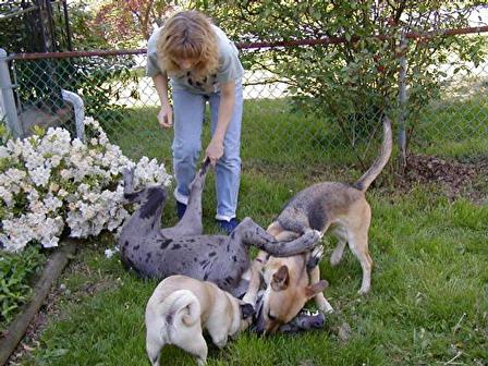 playful, loves to fetch, and gets excited when it's time to take a walk. Peyton is still a bit skittish when sudden movements are made ( due to her past mistreatment I guess ). She likes to be the center of attention, and asserts herself as the alpha dog in our group. Pedigree dog food is what she is used to. If another brand is given to her, she gets sick. We have had to put her on a low residue dog food in the past, until we found Pedigree to be OK. She currently lives & gets along with a 3 males, a Dane, pug, & midget |