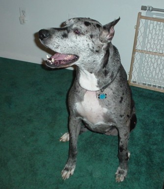 female merle ~ 6 yrs. She weighs in at about 120 lbs. She is very loving, and will seldom leave my side...or at least the room I'm in. Loves attention! She is very
