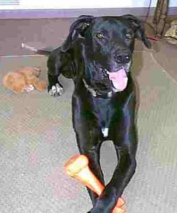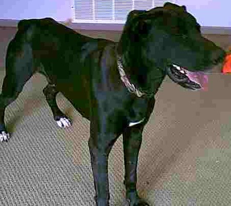 Sox - 1 year black, with white on his paws, chest and a spot on his chin, male with natural ears. He came to us from a shelter. Sox is a sweet boy who gets along with everyone. He is currently living with cats, Danes, and other dogs of all sexes. Sox is a submissive male, and will walk away from his food when the female in the house wants his food. He did come to us a bit skinny, but he is gaining rapidly with food and love. He has been loose in the house and does not show any destructive tendencies. He loves to sit on your lap, and will even try when you are standing! Sox came to MAGDRL in April 2003. |