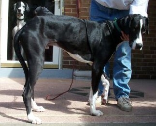 9 month old neutered male mantle with natural ears. Ted was turned into a humane association by his owners. He is living in a foster home with a small dog, dane, & 6 cats. He loves other dogs and is great with them. He also loves children though may be a bit exuberant. He is a very sweet dog who needs some work on discipline. Below is from the evaluator: